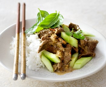 Grind together chilli, garlic, ginger, coriander root, lemon grass, shrimp paste and sugar in a food processor or with a pestle and mortar and set aside. Heat oil and fry shallots for a few minutes. Add spice paste and fry for another minute or two. Add beef and stir fry until browned. Add tamarind concentrate, coconut milk, lime leaves and fish sauce. Simmer for 20 minutes. Add lime juice, basil and cucumber and simmer to heat through. Serve with rice, garnished with coriander leaves.