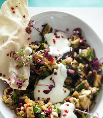 Sweet roasted brinjal, tossed with chilli and lemon and served with lashings of yoghurt, makes a refreshing side for your braai, or a lovely, light meat-free Monday option. Fry with a tiny dash of oil in a griddle pan for an indoor version.