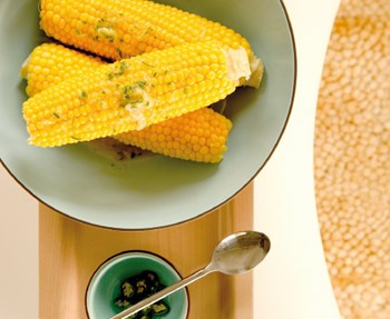 Cook the corn in salted boiling water until done, about 15 to 20 minutes. Mash together all the butter ingredients and chill in the fridge. Drain the corn, plate, and top with a good dollop of butter.