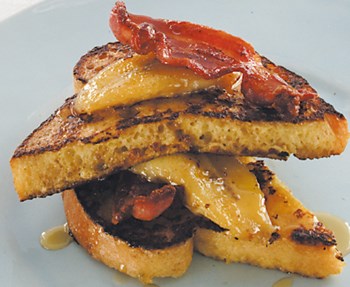 Grill or fry the bacon until crisp. Keep warm. Whisk the eggs, milk and a pinch of nutmeg. Soak the bread in the egg mixture (you’ll have to do this in batches). Heat a dollop of butter in a pan and fry the bread until golden on both sides. Serve topped with sliced bananas, crispy bacon and maple syrup.
