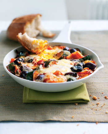 Meanwhile, preheat the grill. Make four slight hollows in the tomato mixture and very gently break one egg into each. Sprinkle over the cheese and cook under the grill for about 10 minutes or until the eggs are set as you like them