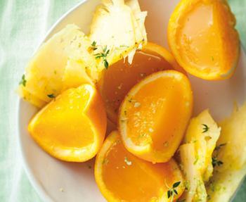 Squeeze the juice from the oranges and keep aside. Using a spoon, carefully remove the remaining pith and membranes from the orange shells. Soften the gelatine powder in a little cold water. Gently heat the orange juice. Stir in the softened gelatine until melted. Add the mango and alcohol. Carefully place orange halves on top of cups to balance and pour in jelly. Leave to set and cut into quarters with a sharp knife or leave in halves. Toss the pineapple into sugar and thyme and leave to macerate in the fridge for 30 minutes. Serve with the jellies.