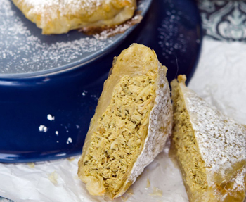 Repeat with remaining phyllo and place the pies on a greased baking tray. Bake for 30 minutes at 150 degrees Celsius 8. When ready, dust with icing sugar. Serve with orange blossom water on the side.