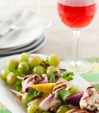 Pour the mixture over the chicken pieces and marinade for 4 to 8 hours. Thread the chicken pieces onto soaked bamboo skewers and alternate with grapes, lemon quarters and petals of red onion. Cook on a hot griddle pan for 5-8 minutes a side. Serve with a glass of chilled Durbanville Hills Rosé.