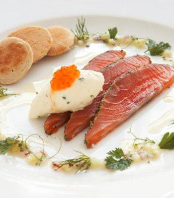 To serve, slice the salmon to desired thickness. Arrange neatly on plate. Using a hot spoon, shape the pannacotta into a barrel like shape (quenelle) with the salmon caviar and place next to the salmon. Drizzle a small amount of dressing over the salmon and around the plate. Carefully place the warm prawn springroll next to the salmon. Garnish with the radish salad.
