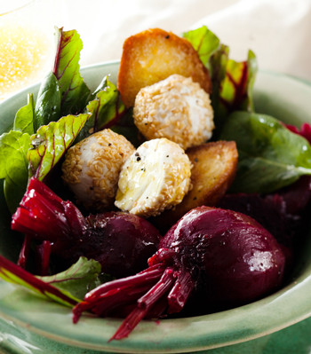 Pour the orange juice and water into a pot. Add the beetroot and bring to the boil. Simmer for 15 to 20 minutes or until soft. Cut the goat’s cheese into 8 slices and roll into balls. Place the sesame seeds in a bowl and roll the cheese balls in the seeds, coating them evenly. Drizzle the baguette slices with olive oil, sprinkle with salt and grill both sides until crispy. Place the beetroot, whole or halved, on top of the spinach with the goat’s cheese and croutons. Drizzle with the dressing and serve with the toasted baguettes.
