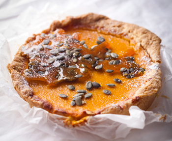 Blend 500g of cooked cubed pumpkin in a food processor until smooth with 1 T of cream to loosen the mixture. Remove from the blender and mix with the rest of the cream, maple syrup, spices and eggs until smooth. Pour the pumpkin mixture into the baked crust and bake for 45 minutes – 50 minutes until set, leave to cool before serving with shards of pumpkin seed praline or a dusting of icing sugar.