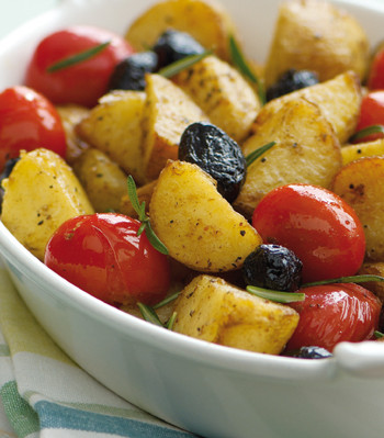 Peel the potatoes and cut into small chunks. Parboil for 10 minutes, then drain and blot well to absorb excess moisture. Heat a thin layer of oil in a frying pan. Add the half-cooked potatoes, rosemary, garlic, a little salt and a lot of peperoncino or black pepper – as much as you can take. Toss the potatoes in the oil so they are well coated, then leave them to brown over a medium heat, flipping occasionally. Keep checking to be sure they aren’t burning or sticking. After 10 to 15 minutes,when the potatoes are almost golden and crispy-crunchy, throw in the tomatoes and olives and mix gently. Cook for a few more minutes until the tomatoes start to go limp and the skins look a little charred. Sprinkle with parsley and serve, removing the garlic if preferred.