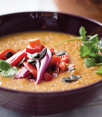 Spiced sweet potato soup with red pepper and lime salsa