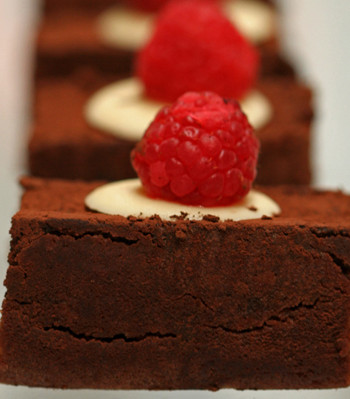 For the ganache, place chopped chocolate disks into a mixing bowl. In a small saucepan, over medium heat, bring the cream and butter to just below boiling point and pour mixture over the chocolate. Let stand for 30 seconds and then stir until smooth. Spread over the brownies while it’s still warm. When the ganache has firmed, cut the brownies.