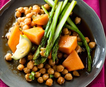 Combine the garlic, grated ginger, lemon juice, sesame oil and soy sauce. Toss in the chickpeas, spring onions, pawpaw and asparagus.