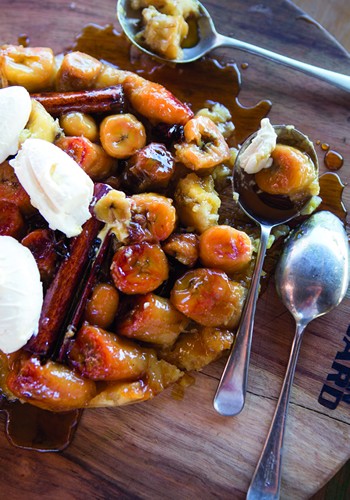 Remove the tart from the heat and allow to cool slightly, then place a wooden board over the top of the pan and carefully flip the pan over, so that the banana is on the top and the pastry at the bottom. Place it on the table with some bowls, double-thick cream and spoons, and watch it get devoured faster than a heartbeat.