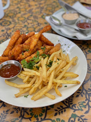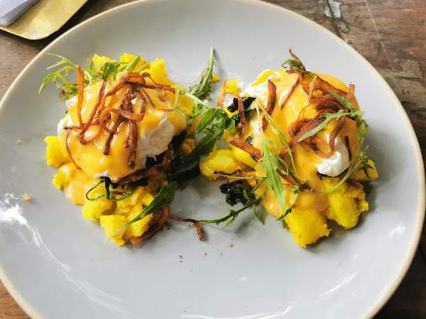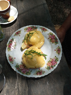 Exposed beams, chandeliers, mismatched wooden tables and chairs and vintage objects set the scene inside, while Berea’s ladies-who-lunch happily languish under the trees in the pretty courtyard.