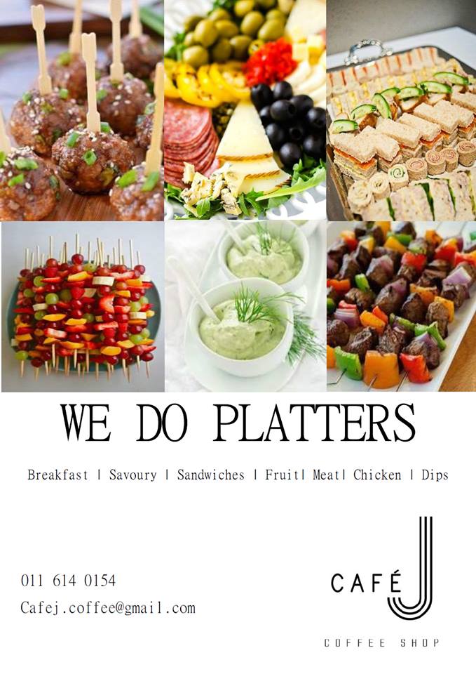 Cafe J is a modern contemporary coffee shop located in Kensington, Johannesburg. The Coffee Shop serves espresso based coffees, lattes, smoothies, milkshakes and a huge variety of gourmet meals such as freshly prepared sandwiches, healthy wraps, burgers, pizzas, and freshly baked cakes, muffin, scones and croissants baked by their local bakery. We also provide platter catering services.