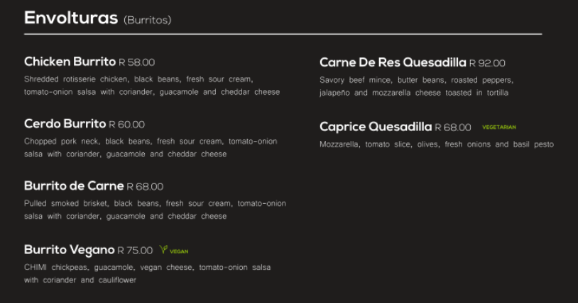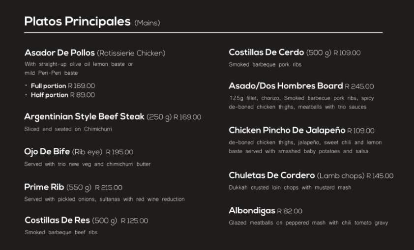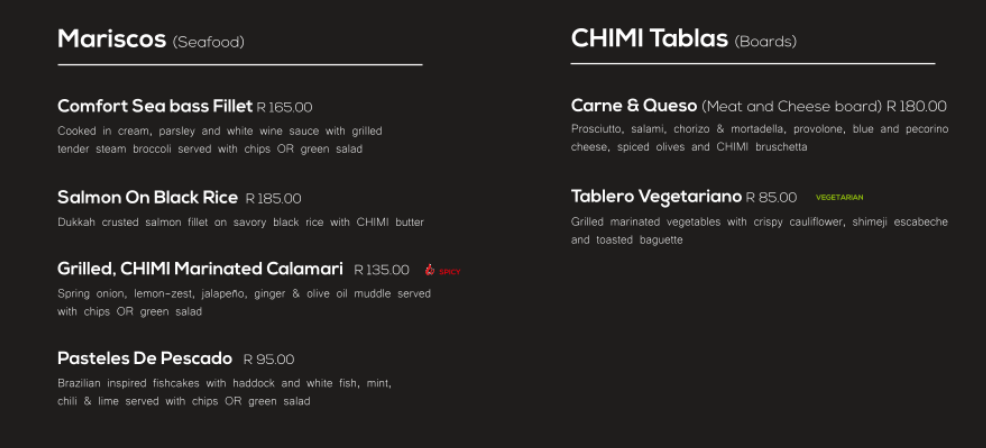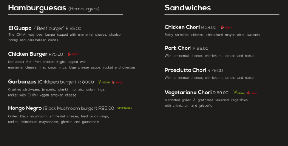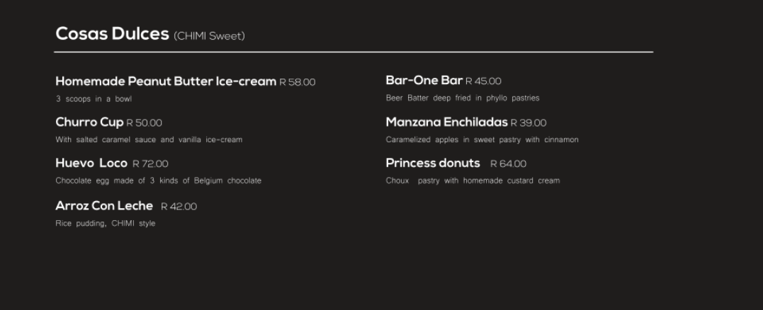 Chimichurri's atmosphere is unlike any other. It's fun, different, happy, exciting and you really do feel the Latin American vibe. The food makes you feel as if you were travelling the Latin American world and the energy inside of our restaurant radiates that Latin energy throughout every table. The waiters, the managers, the chefs are there to make sure that you have the best Latin experience that you can find in South Africa. I really do hope that you experience this kind of dining because it's definitely a dining experience that is like no other.