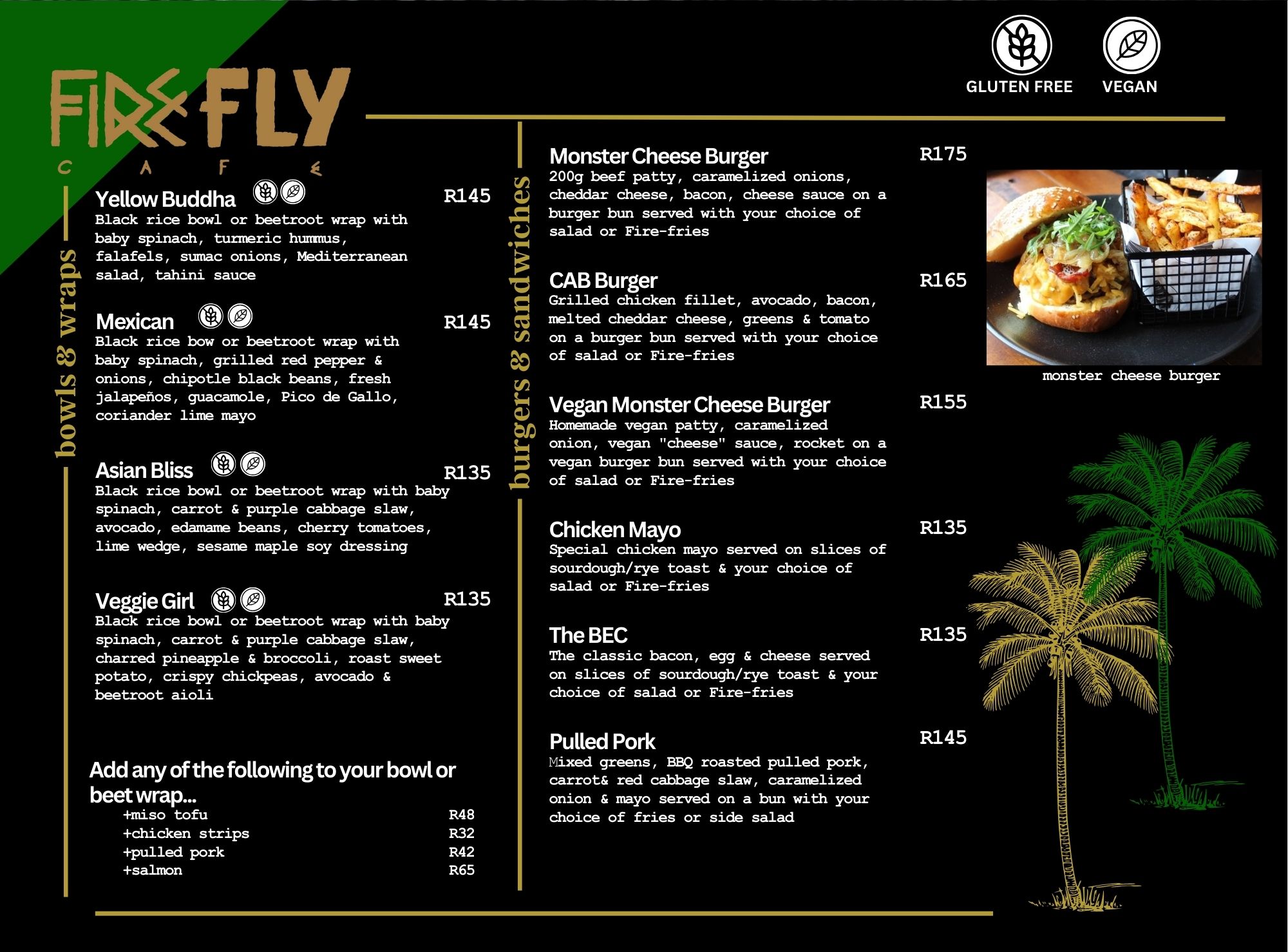 This is a chic and trendy café situated at the beachfront strip of Camps Bay. We believe in the power of a great cup of coffee, fantastic meals and a cocktail watching the sunset. Our food is clean, quality-driven, vegan friendly and our recipes leave you wanting more. Our coffee is a blend of the finest beans from Brazil and Uganda. Our atmosphere is welcoming to all, and we are pet friendly! Be sure to pop in for a good cup of coffee, a drink or a lovely bite to eat. We serve Breakfast and Lunch until 6pm Mon-Sunday. Firefly – Let your imagination fly…