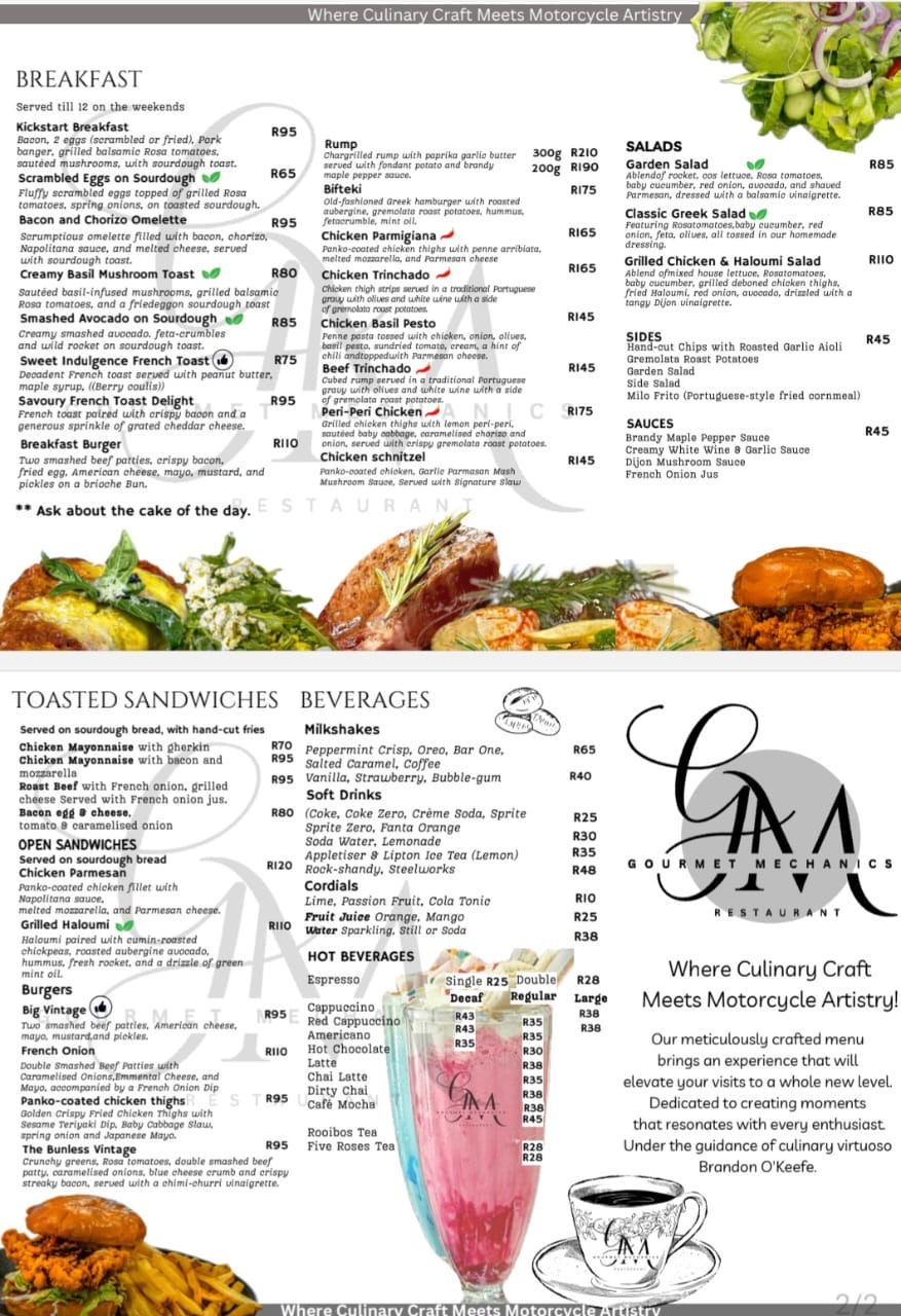 Gourmet Mechanics, where culinary craft meets motorcycle artistry, creating an unparalleled dining experience in the heart of Somerset West, Cape Town. Our menu is a testament to innovation, featuring premium ingredients and exquisite flavours meticulously curated to cater to a spectrum of tastes.