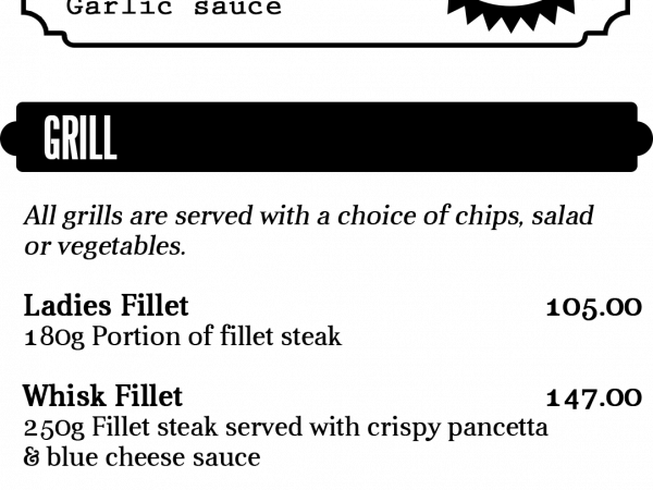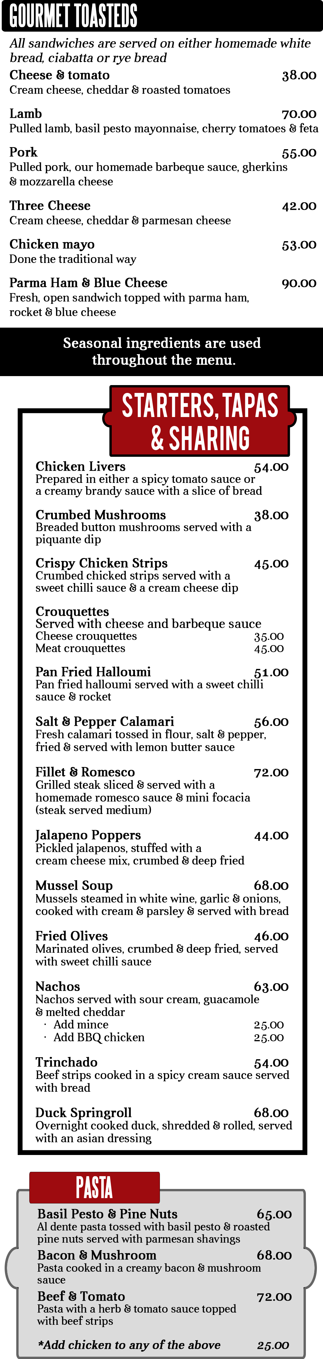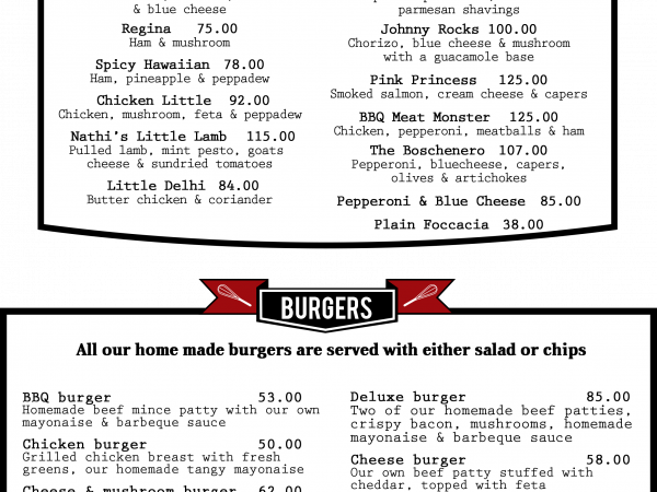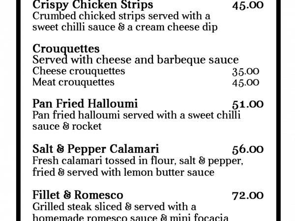 Bistro fare, Burgers, Pizzas, Pub fare, Tapas